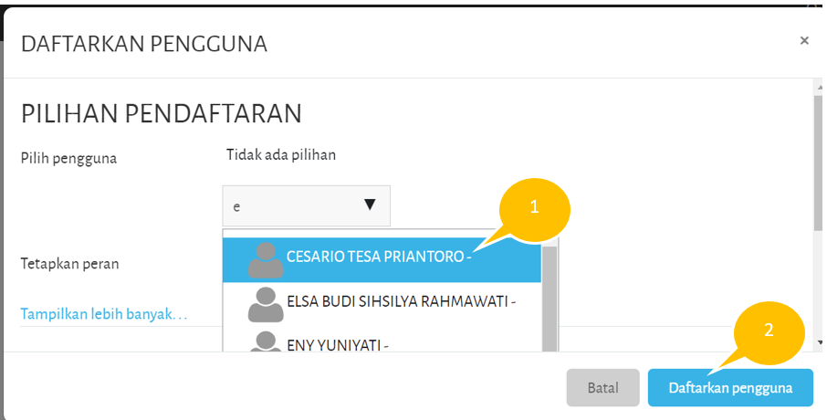 Ketikkan nama-nama yang ingin didaftarkan sebagai mahasiswa, kemudian klik tombol Daftarkan pengguna :