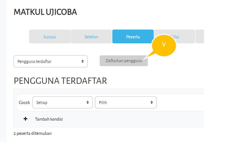 Dalam beberapa kasus terkadang mahasiswa mengalami kesulitan untuk melakukan pendaftaran secara mandiri kedalam kelas LMS. Bila dosen mengalami kasus demikian, maka mahasiswa dapat didaftarkan secara manual kedalam kelas LMS. Pendaftaran manual dapat dilakukan melalui laman daftar peserta. Klik tombol Daftarkan pengguna untuk memasukkan mahasiswa baru.