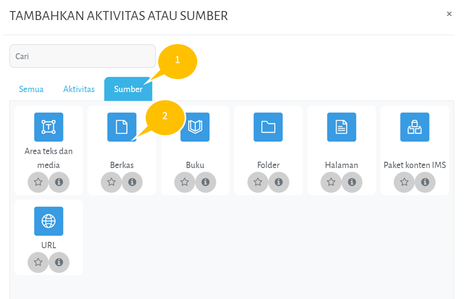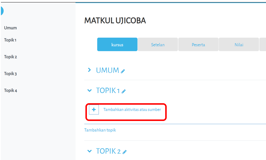 Berkas bahan ajar merupakan materi pelajaran yang dapat diakses oleh mahasiswa. Berkas bahan ajar bisa berupa slide presentasi, bahan bacaan, file proyek maupun jenis bahan ajar lainnya. Pengunggahan berkas bahan ajar dapat dilakukan dalam mode edit kursus. Setelah masuk dalam mode edit, tambahkan aktivitas baru pada topik yang kita inginkan.