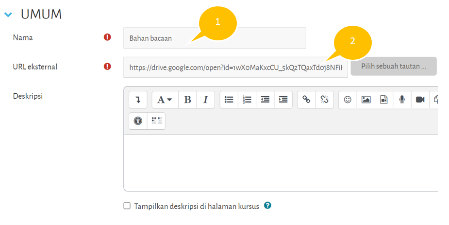 Selain disajikan dalam bentuk berkas unggahan, bahan ajar dapat pula diambilkan dari pranala luar (Alamat atau link website diluar LMS). penggunaan pranala luar merupakan metode penyematan bahan ajar yang efisien, karena kita tidak perlu mengunggah ulang bahan ajar, kita cukup menghubungkan aktivitas dengan link/pranala luar. Untuk dapat menambahkan aktivitas pranala luar, terlebih dahulu kita harus masuk kedalam mode edit. kemudian tambahkan aktivitas baru yang bertipe URL :