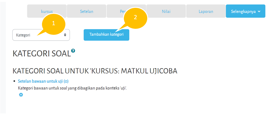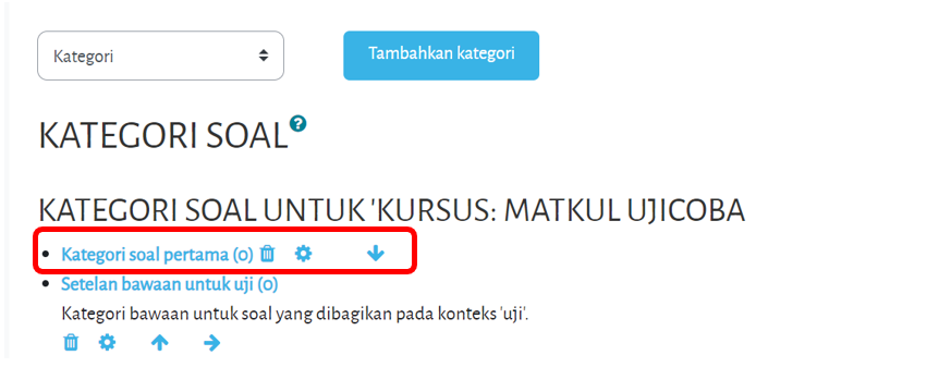 Masukkan nama kategori soal, kemudian klik tombol "Tambahkan kategori". Klik pada kategori soal untuk membuat soal :