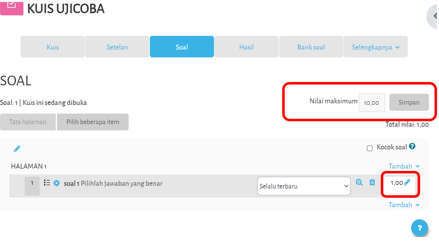 Setelah semua soal yang diinginkan masuk kedalam kuis, tahap berikutnya adalah mengatur nilai. Nilai yang diatur adalah nilai maksimum dan juga nilai per soal. Total nilai per soal harus sama dengan nilai maksimum. Bila nilai maksimum sama dengan 10 dan jumlah soal adalah 5, maka nilai per soal bisa diisi dengan 2 poin, sehingga bila semua jawaban benar, maka mahasiswa akan mendapatkan 10 poin.