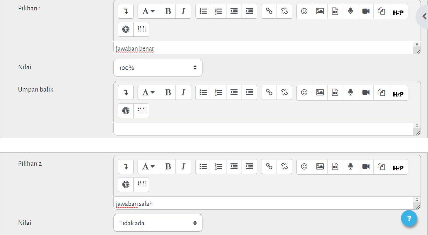 Setelah masuk dalam kategori soal, klik "Buat soal baru" untuk membuat soal. Pilih jenis soal yang akan dibuat, misal "Pilihan ganda". Pada laman editor soal, masukkan Nama soal dan Teks soal. Pada soal pilihan ganda berikan nilai 100% untuk pilihan jawaban yang dianggap benar dan biarkan kosong untuk jawaban yang salah.