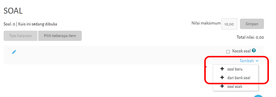 Setelah kuis tersimpan, klik pada kuis untuk menghubungkan kuis dengan bank soal. Pada saat meng-klik nama kuis, dosen akan diberikan tampilan editor kuis. Klik tombol "Tambahkan soal" untuk menambahkan soal dari bank soal. Pada dropdown "tambah" pilih "dari bank soal" :