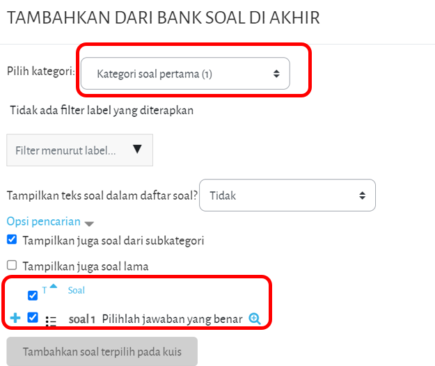 Pilih kategori soal berikut juga dengan daftar soal yang ingin dimasukkan kedalam kuis tersebut, kemudian klik tambahkan soal terpilih.