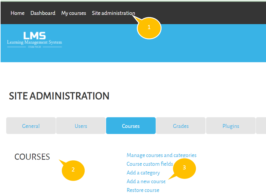 LMS ITKM WCH telah dilengkapi dengan daftar matakuliah standar sesuai data kurikulum yang terdapat dalam Sistem Informasi Akademik, namun demikian dinamika kurikulum terkadang memerlukan kita untuk menambahkan matakuliah baru. Penambahan matakuliah dapat dilakukan melalui laman "Site adaministration - Courses - Manage course and categories"