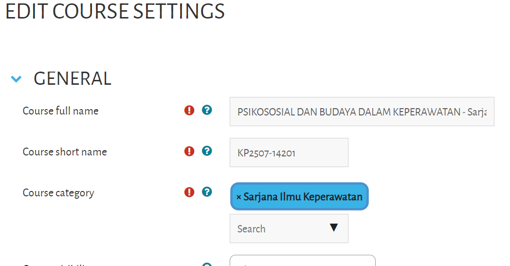 Terdapat 3 informasi penting yang harus diisi, yakni course fullname, course shortname dan course category. Course fullname diisi dengan nama matakuliah, course shortname diisi dengan kode matakuliah dan kode prodi, sedangkan course category diisi dengan pilihan program studi. Berikut adalah contoh pengisian informasi matakuliah yang benar :