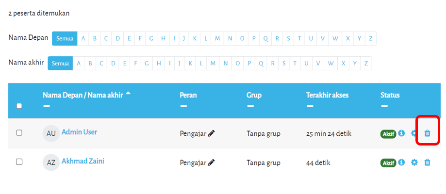 Setiap kali kelas berakhir (akhir semester), dosen harus mengosongkan kelas daring agar dapat digunakan oleh mahasiswa lain pada semester berikutnya. Mengosongkan kelas berarti mencabut partisipasi mahasiswa dari kelas. Hal ini dapat dilakukan melalui laman daftar peserta. Pada tiap-baris peserta terdapat tombol dengan icon sampah. Klik tombol tersebut untuk mengeluarkan mahasiswa dari kelas.